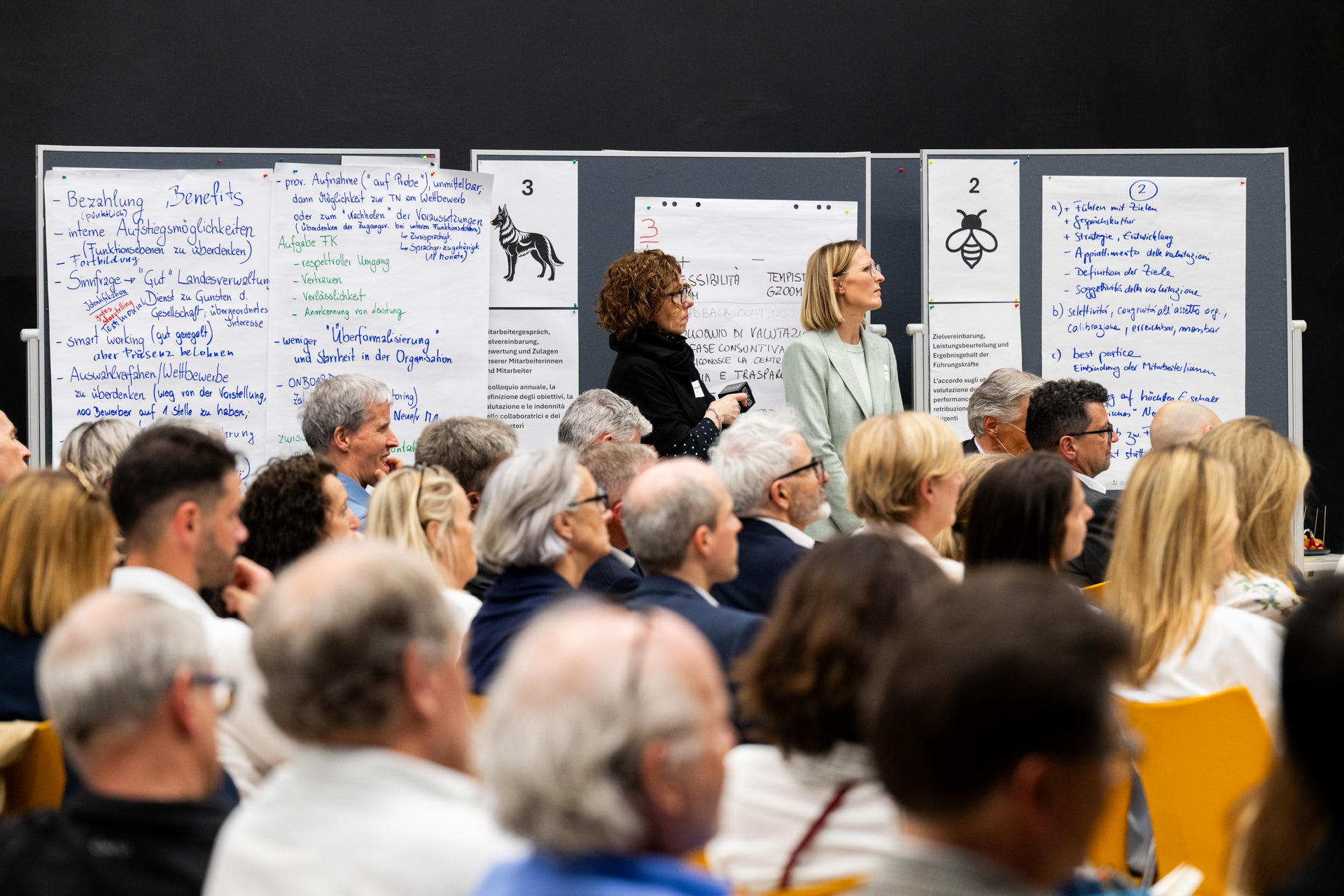 Rund 200 Führungskräfte der Landesverwaltung diskutieren beim Führungskräftetag im NOI Techpark in Bozen, wie moderne Führung den Service für Bürgerinnen und Bürger stärkt
