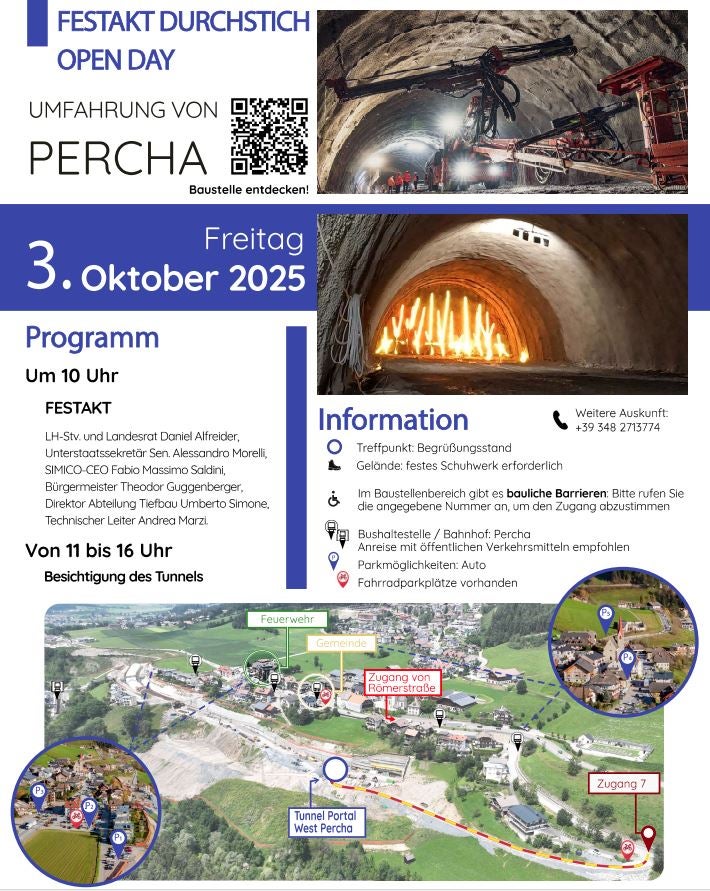 Von 11 bis 16 Uhr ist dann die Besichtigung des Tunnels vorgesehen, zu der die gesamte Bevölkerung eingeladen ist. Treffpunkt für die Begehung ist der Begrüßungsstand beim Tunnelportal. Festes Schuhwerk ist erforderlich. Zumal es im Baustellenbereich bauliche Barrieren gibt, sind Menschen mit Gehschwierigkeiten und Menschen mit Behinderungen dazu aufgerufen, die Informations-Hotline zu kontaktieren (Tel. 348 2713774), um den Zugang abzustimmen.