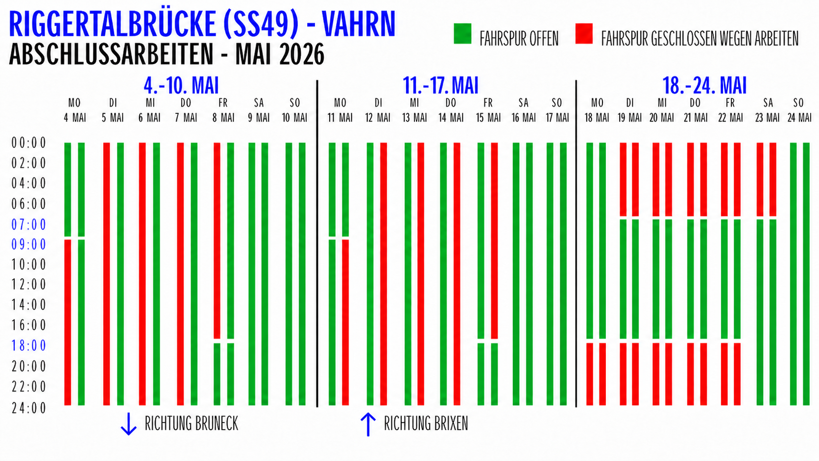 In der darauffolgenden Woche ab 11. Mai finden ähnliche Arbeiten auf der Fahrspur in Richtung Brixen statt, ebenfalls für rund drei Tage. Auch hier wird der Verkehr durchgehend mit Wechselverkehr geregelt.