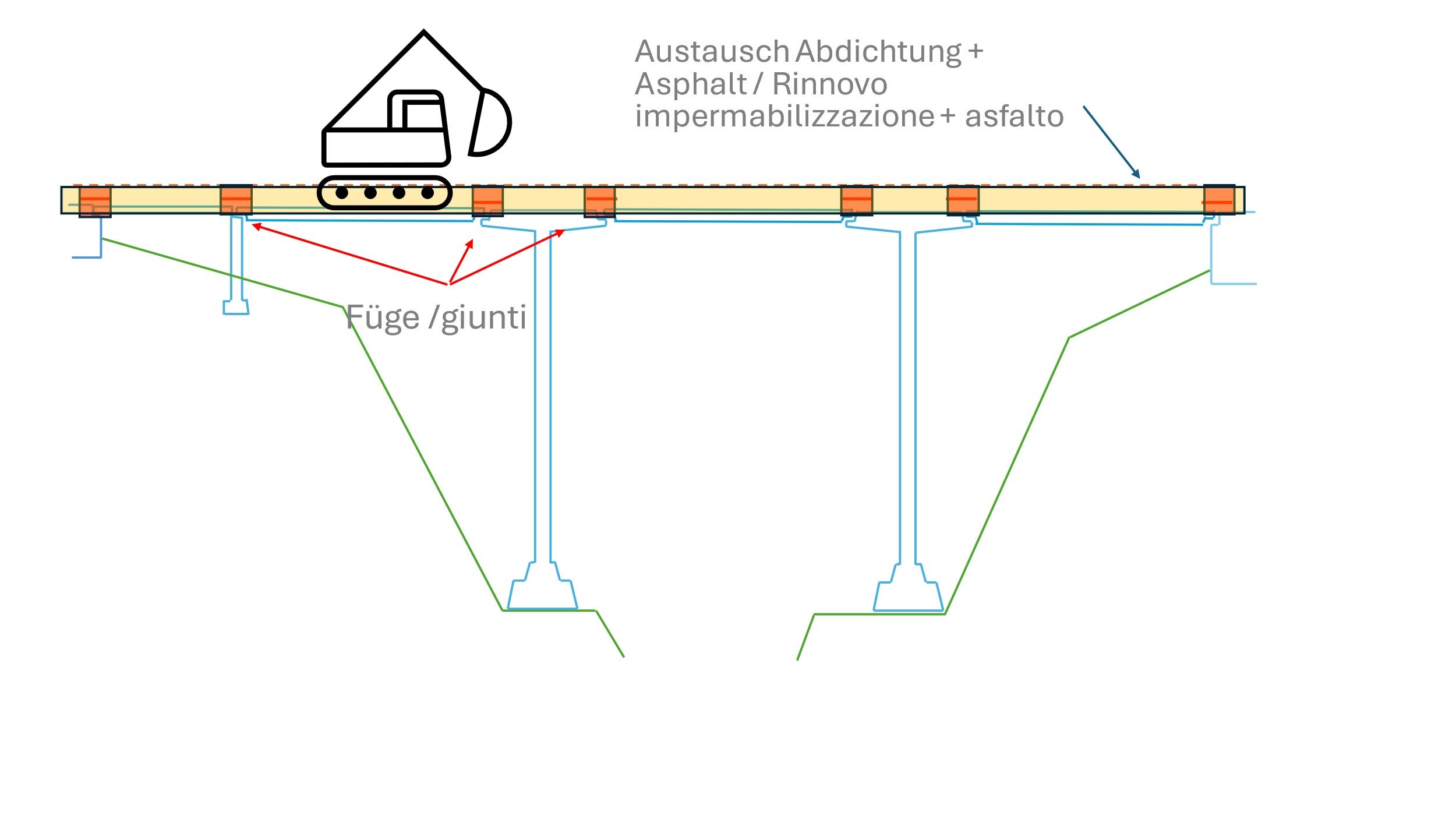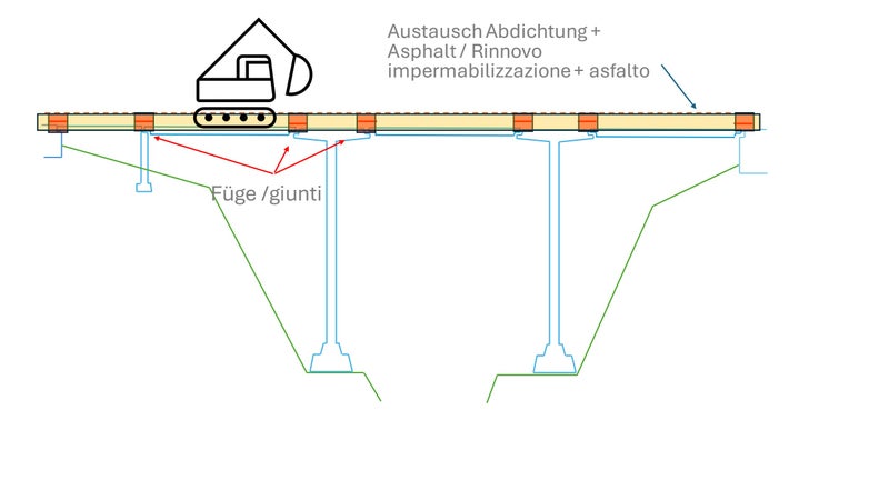 Für den Abschluss der Baustelle sind weitere Arbeiten vorgesehen: Abfräsen des Asphalts, Neuabdichtung und Austausch der Fugen. Diese Eingriffe sind für Frühjahr 2026 geplant, da sie im Winter nicht möglich sind.